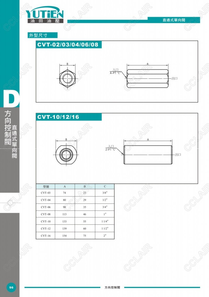 YUTIEN油田 直通式單向閥CVT-03-05,CVT-03-50,CVT-04-05,CVT-04-50,CVT-06-05,CVT-06-50,CVT-08-05,CVT-08-50,CVT-10-05 CVT-10-50,CVT-12-05,CVT-12-50,CVT-16-05,CVT-16-50