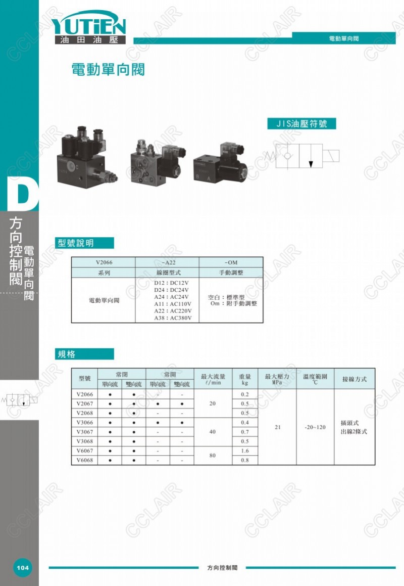 YUTIEN油田 電動單向閥V2066,V2066-OM,V2067,V2067-OM,V2068,V2068-OM,V3066,V3066-OM,V3067,V3067-OM V3068,V3068-OM,V6067,V6067-OM,V6068,V6068-OM
