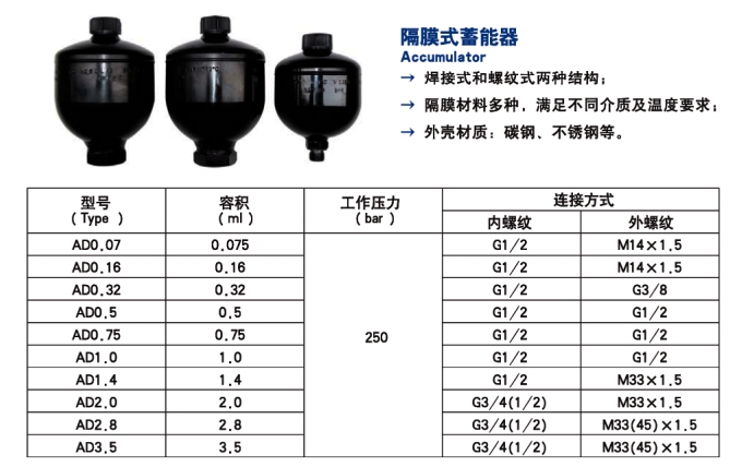 AD0.07,AD0.16,AD0.32,AD0.5,AD0.75,AD1.0,AD1.4,AD2.0,AD2.8,AD3.5,隔膜式蓄能器