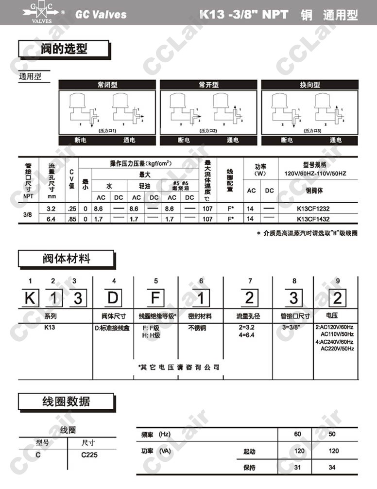 K13CF1232,K13CF1432,GC Valves二位三通杠桿式電磁閥