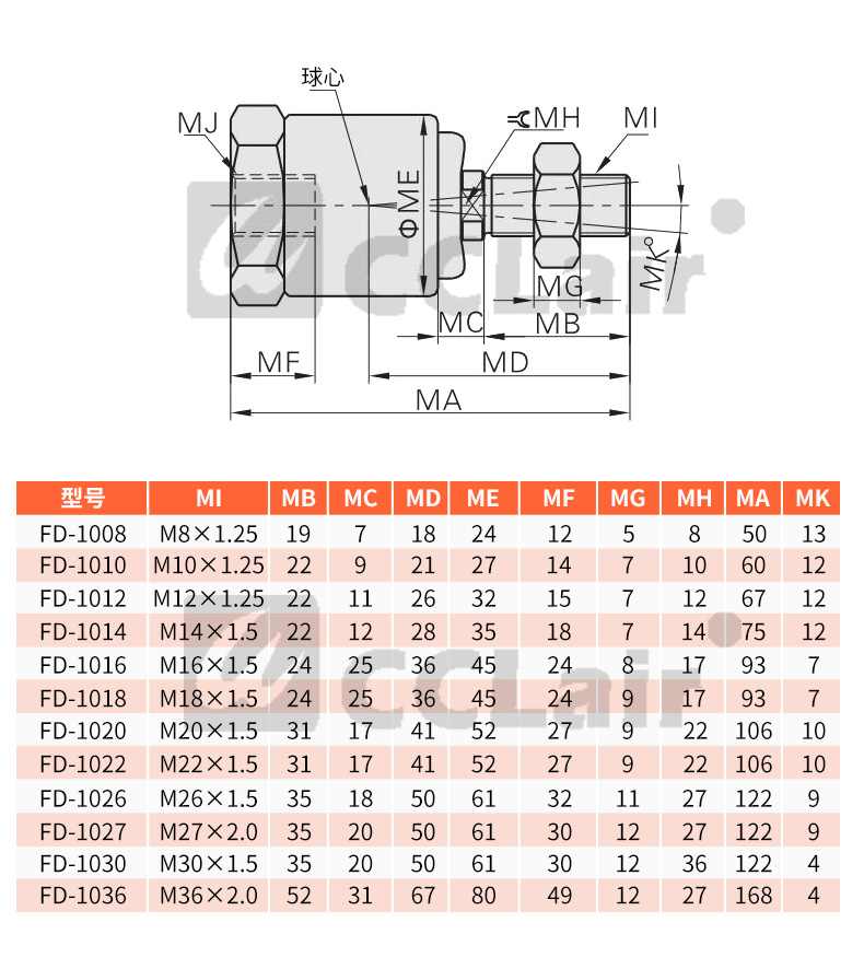 浮動接頭: FD1003(M3*0.5),FD1004(M4*0.7),FD1005(M5*0.8),FD1006(M6*1),FD1008(M8*1.25),FD1010(M10*1.25),FD1010(M1