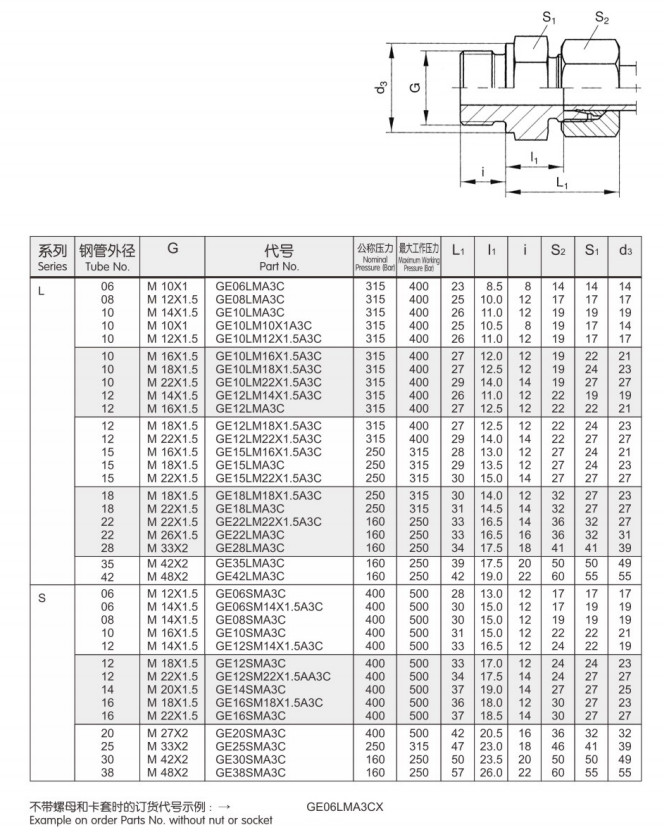 型號(hào): GE06LMA3C,GE15LMA3C,GE16SMA3C,GE10LM12X1.5A3C,直通接頭