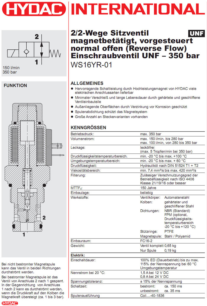 WS16YR-01-C-N-24DG,WS16YR-01-C-N-230AG,HYDAC電磁2/2方向座閥