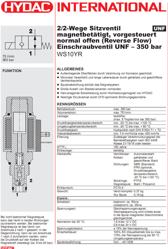 WS10YR-01-C-N-24DG,WS10YR-01-C-N-230AG,HYDAC電磁2/2方向座閥