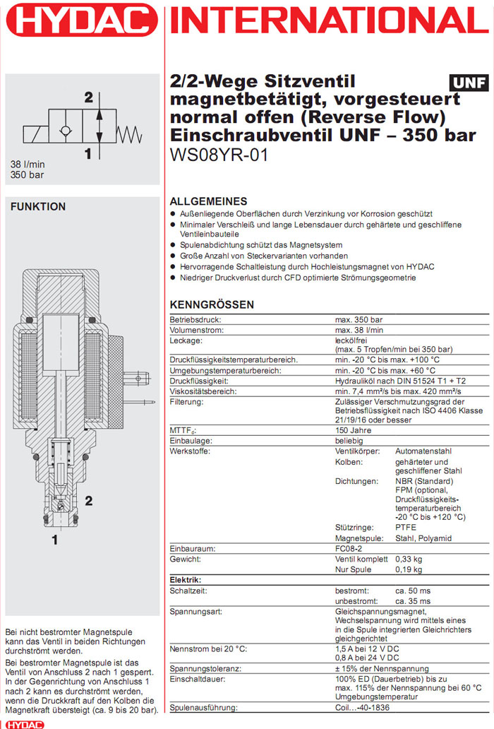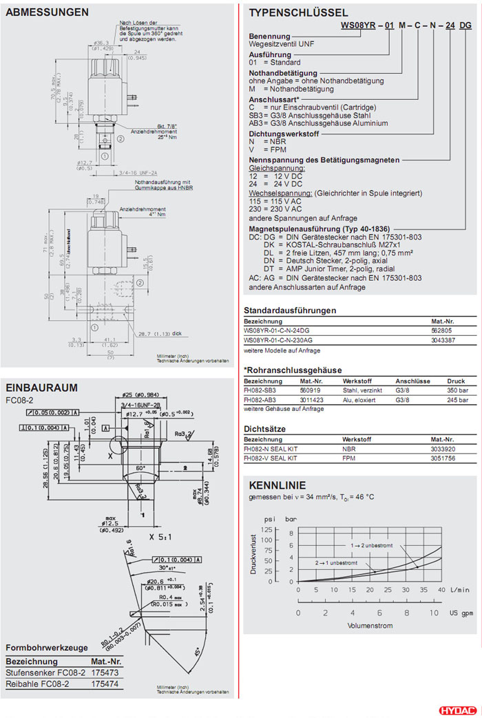 WS08YR-01-C-N-24DG,WS08YR-01-C-N-230AG,HYDAC電磁2/2方向座閥