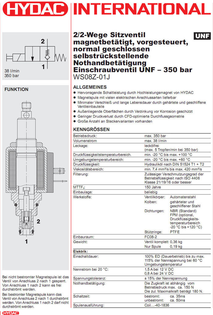 WS08Z-01J-C-N-24DG,WS08Z-01J-C-N-230AG,HYDAC電磁2/2方向座閥