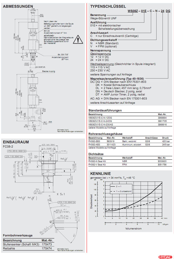 WS08Z-01E-C-N-12DG,WS08Z-01E-C-N-24DG,WS08Z-01E-C-N-230AG,HYDAC電磁2/2方向座閥