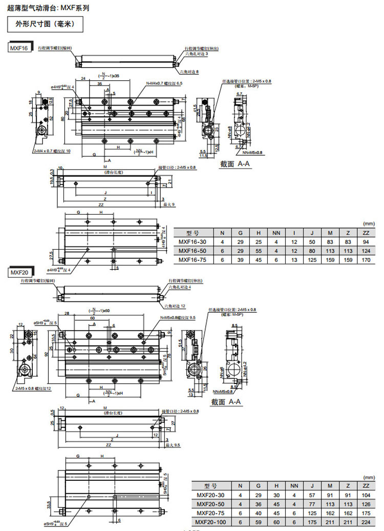 MXF8-10,MXF12-20,MXF16-30,MXF20-30,MXF8-20,MXF12-30,MXF16-50,MXF20-50,SMC超薄型氣動滑臺氣缸
