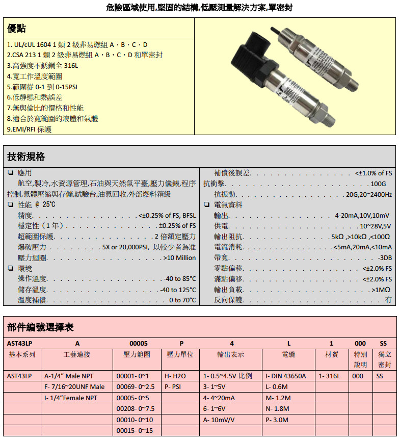 AST43LP-A-00001-H,AST43LP-I-00069-H,AST43LP-I-00005-P,防爆壓力傳感器