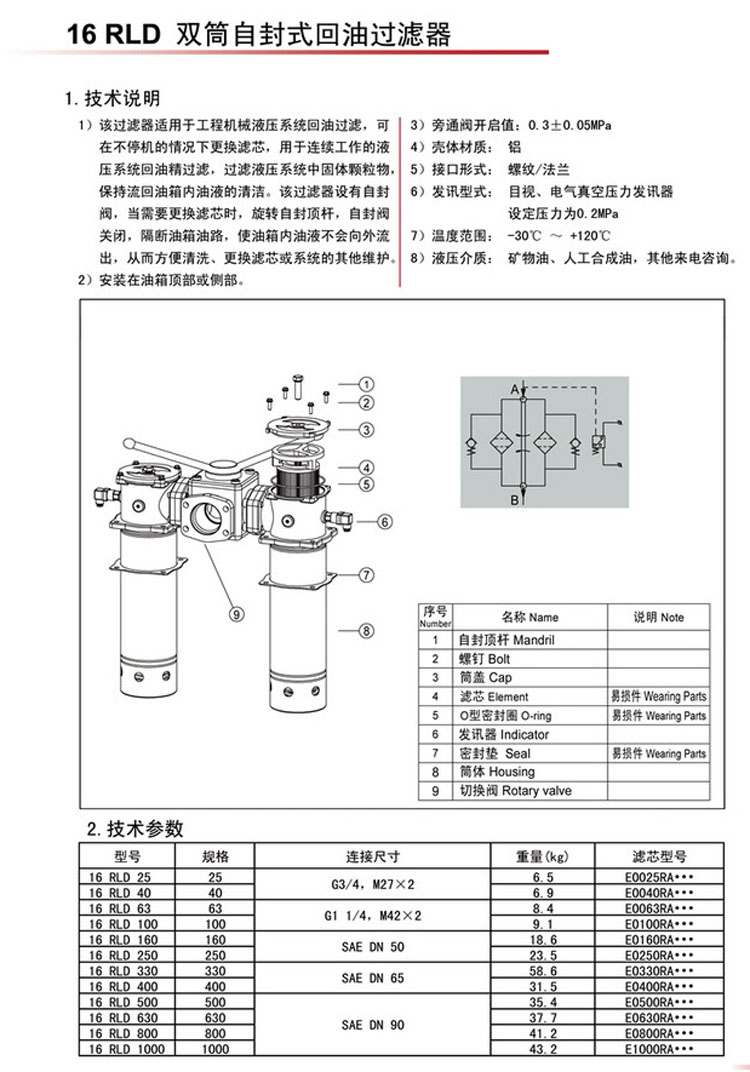 16RLD330,16RLD400,16RLD500,16RLD630,16RLD800,16RLD1000,16RLD330MKN5ABP,雙筒自封式回油過濾器