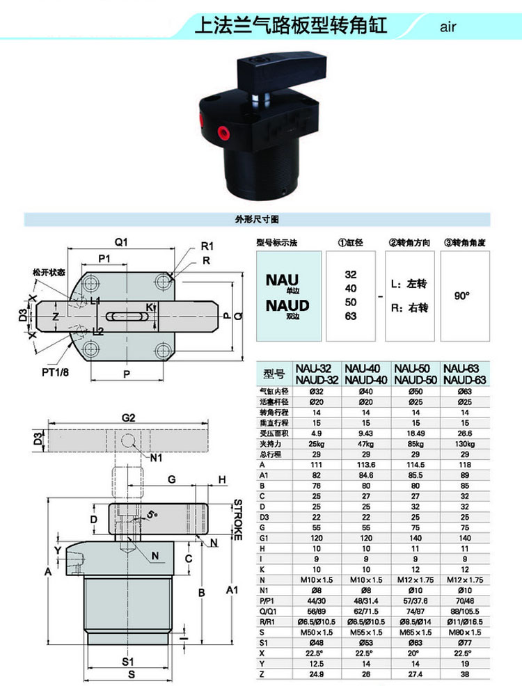 NAU32,NAU40,NAU50,NAU63,NAUD32,NAUD40,NAUD50,NAUD63,NAU32-L90,NAUD32-R90,空壓轉(zhuǎn)角缸 |