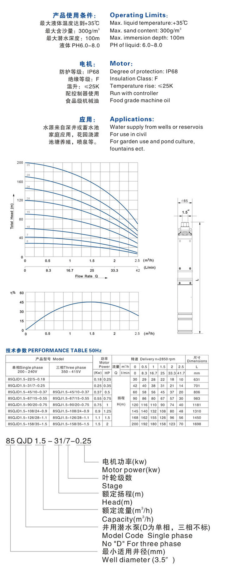 85QJD1.5-22/5-0.18,85QJD1.5-31/7-0.25,85QJD1.5-45/10-0.37,85QJD1.5-67/15-0.55,85QJD1.5-90/20-0.75,井用潛水電泵