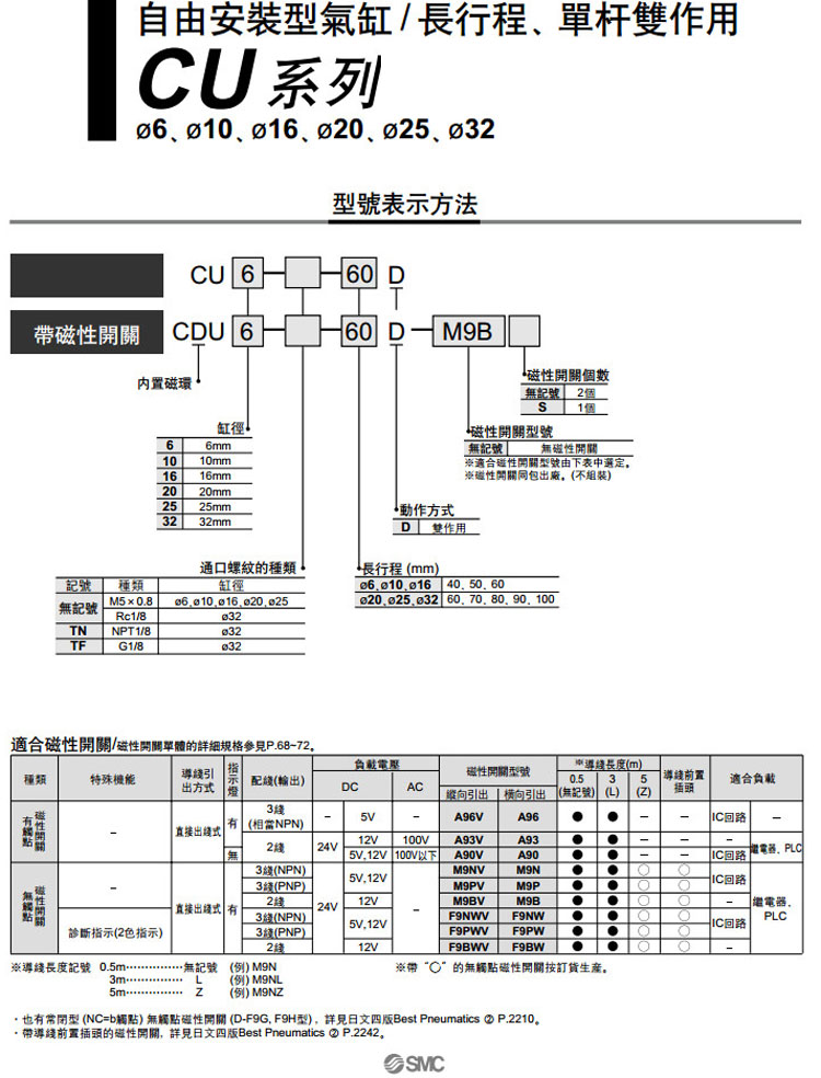 CU6,CU10,CU16,CU20,CU25,CU32,CDU6,CDU10,CDU16,CDU20,CDU25,CDU32,CU6-40D,SMC自由安裝型氣缸