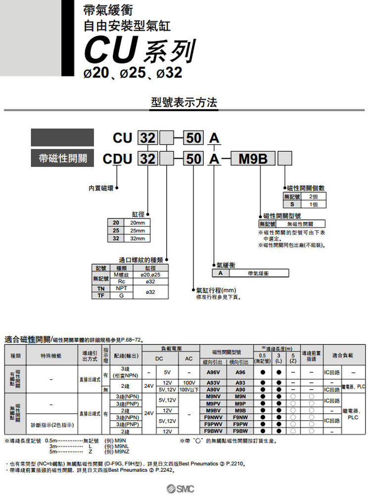 CU20-20A,CU25-20A,CU32-20A,CDU20-20A,CDU25-20A,CDU32-20A,CU32TN-20A,CDU32TF-20A,SMC自由安裝型氣缸