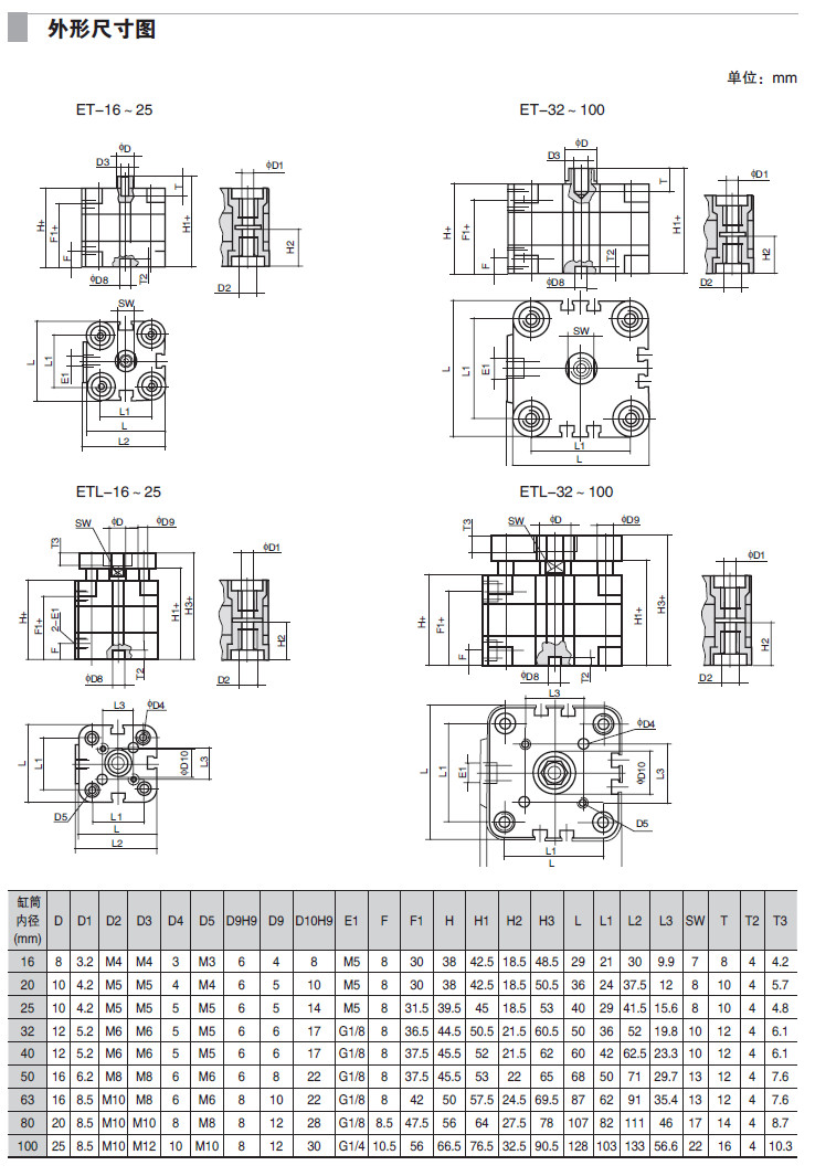ET-16,ET-20,ET-25,ET-32,ET-40,ET-50,ET-63,ETL-16,ETL-20,ETL-32,薄型氣缸