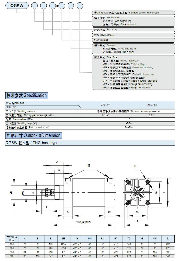 QGSW160×300,QGSW200×300,QGSW250×300,QGSW320×300,QGSW160×500,QGSW200×500,QGSW250×500,QGSW320×500,輕型氣缸