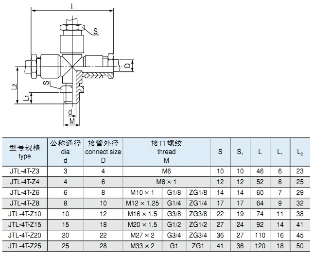 JTL-4T-Z3,JTL-4T-Z4,JTL-4T-Z6,JTL-4T-Z8,JTL-4T-Z10,JTL-4T-Z15,JTL-4T-Z20,JTL-4T-Z25,卡套式四通終端管接頭 |