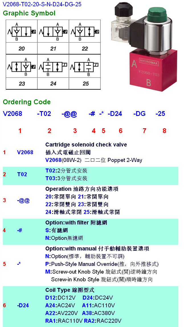 V2068-T02-20,V2068-T02-22,V2068-T02-24,V2068-T03-25,V2068-T03-21,HYDROMAX插入式電磁止回閥