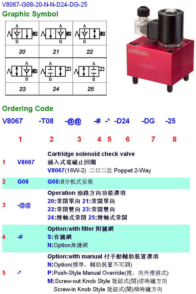 V8067-G08-21,V8067-G08-22,V8067-G08-23,V8067-G08-24,V8067-G08-20-N-N-D24-DG-25,HYDROMAX插入式電磁止回閥 |