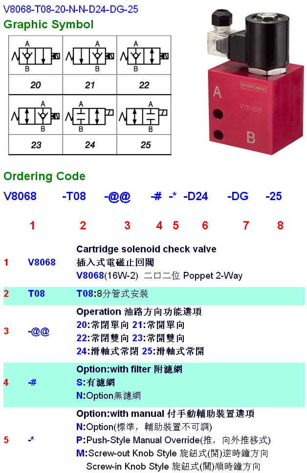 V8068-T08-21,V8068-T08-22,V8068-T08-23,V8068-T08-24,V8068-T08-20-N-N-D24-DG-25,HYDROMAX插入式電磁止回閥 |