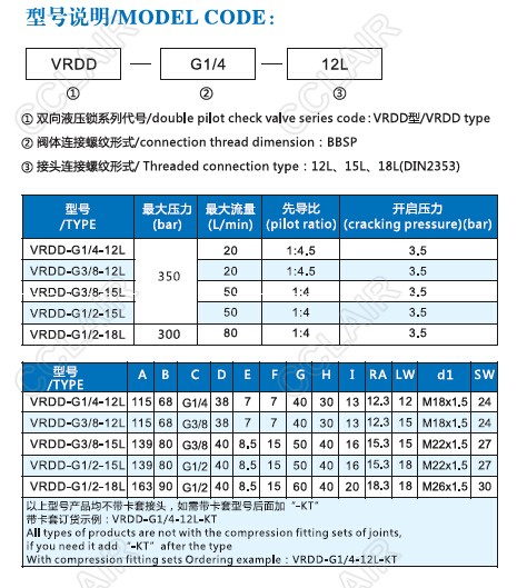 RDD-G1/4-12L,VRDD-G3/8-12L,VRDD-G3/8-15L,VRDD-G1/2-15L,VRDD-G1/2-18L,VRDD,雙向液壓鎖 |