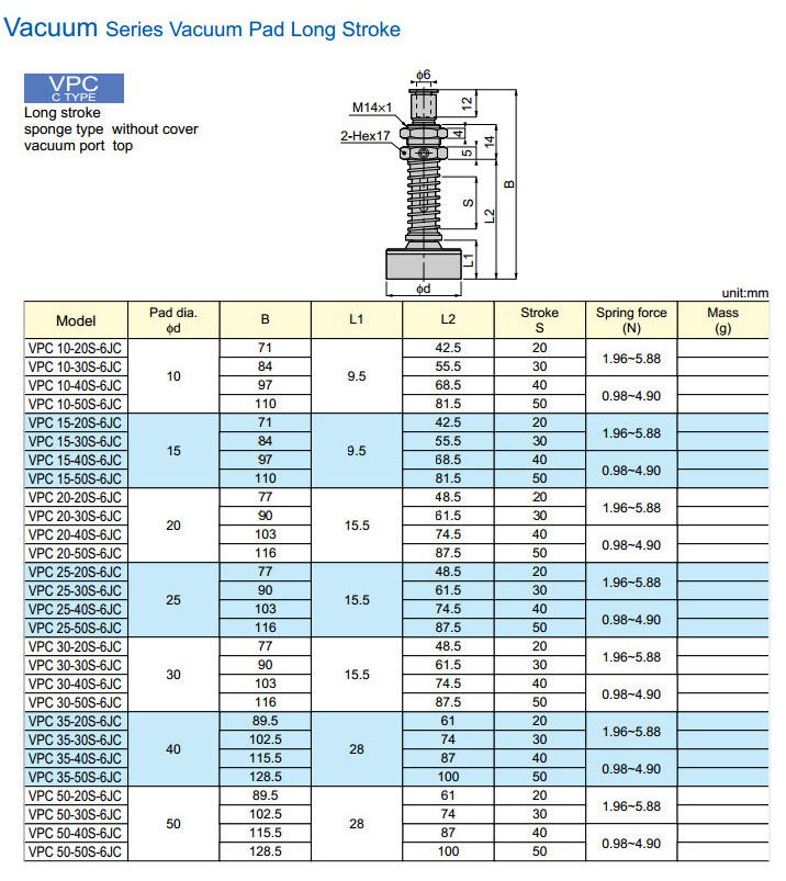 VPC10-20S-6JC,VPC15-20S-6JC,VPC20-20S-6JC,VPC25-20S-6JC,VPC30-40S-6JC,VPC50-20S-6JC,PISCO真空吸盤 |