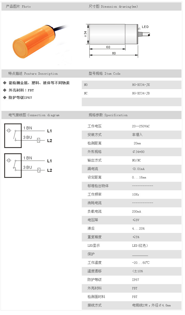 電容式接近傳感器 HG-RY34-JK,HG-RY34-JB,