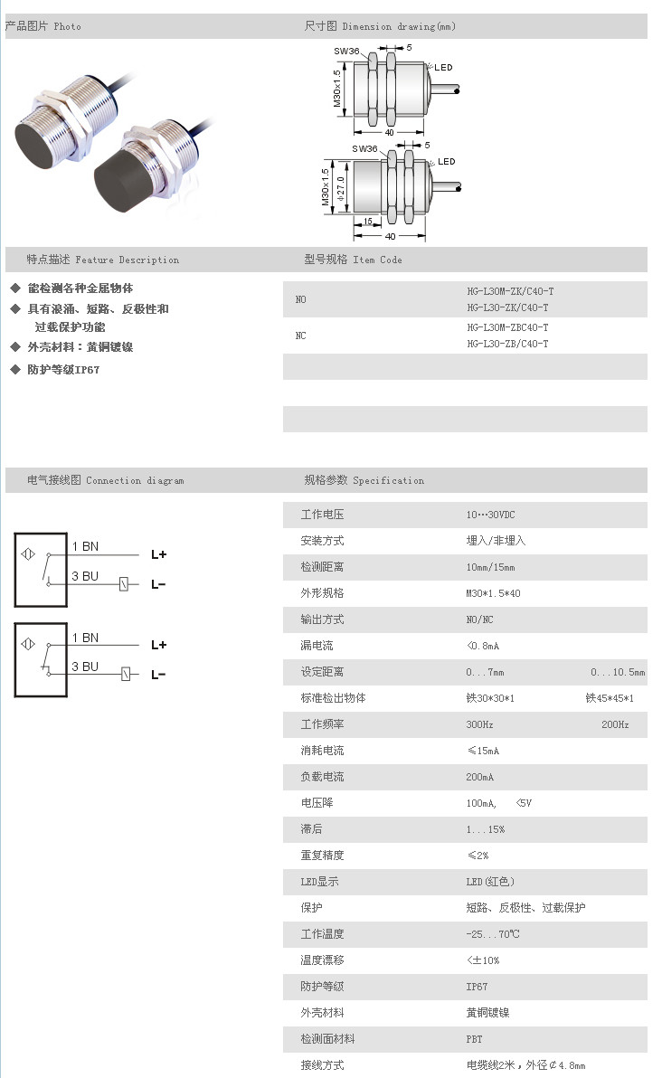 防水/防油/防腐蝕接近開關(guān) HG-L30M-ZK/C40-T,HG-L30-ZK/C40-T,HG-L30M-ZBC40-T,HG-L30-ZB/C40-T, |