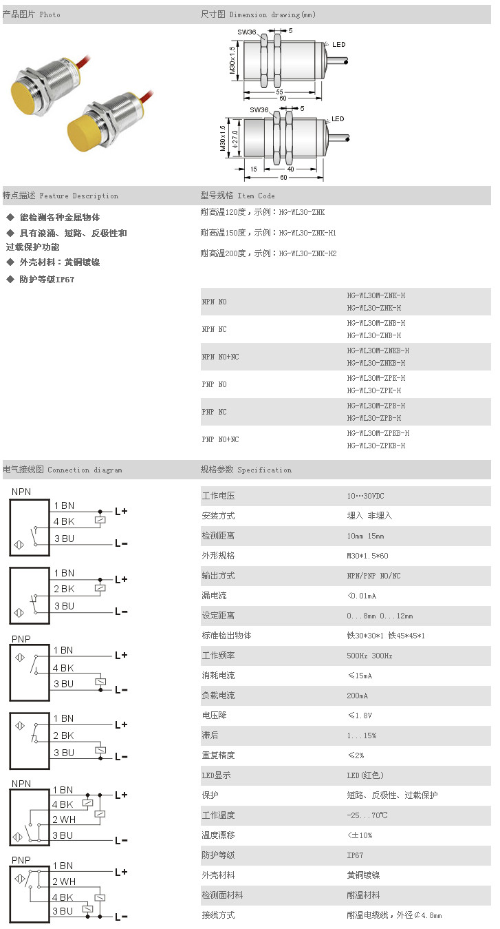 耐高溫接近開(kāi)關(guān)(低溫) HG-WL30M-ZNK-H,HG-WL30-ZNK-H,HG-WL30M-ZNB-H,HG-WL30-ZNB-H,