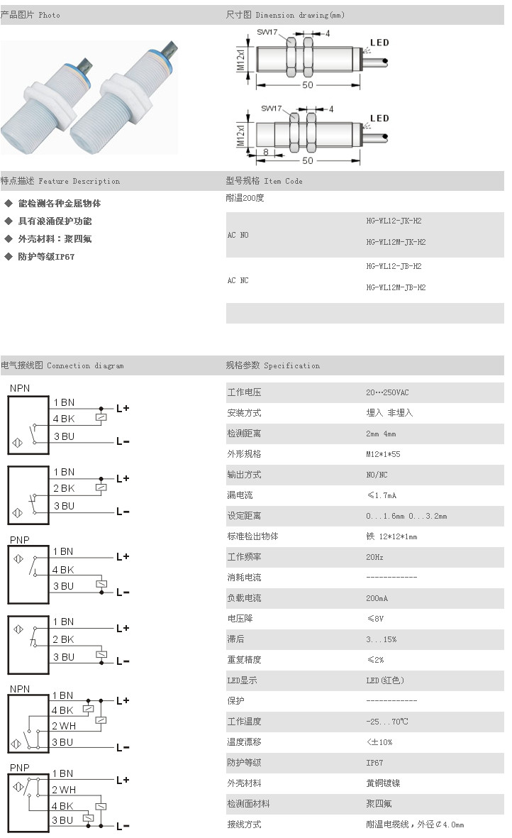 耐高溫接近開關(低溫) HG-WL12-JK-H2,HG-WL12M-JK-H2,HG-WL12-JB-H2,HG-WL12M-JB-H2,
