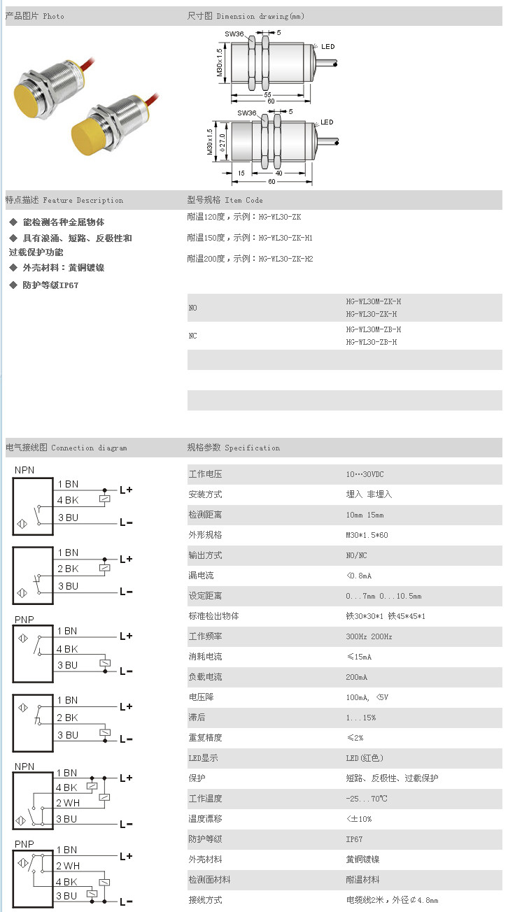 耐高溫接近開關(低溫) HG-WL30M-ZK-H,HG-WL30-ZK-H,HG-WL30M-ZB-H,HG-WL30-ZB-H,
