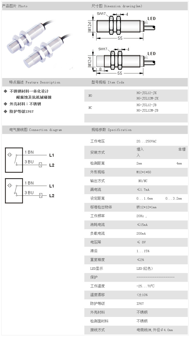 金屬探頭型接近開(kāi)關(guān) HG-JSL12-JK,HG-JSL12M-JK,HG-JSL12-JB,HG-JSL12M-JB,