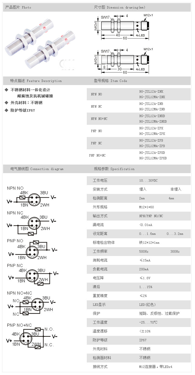 金屬探頭型接近開(kāi)關(guān) HG-JSL12A-ZNK,HG-JSL12MA-ZNK,HG-JSL12A-ZNB,HG-JSL12MA-ZNB,