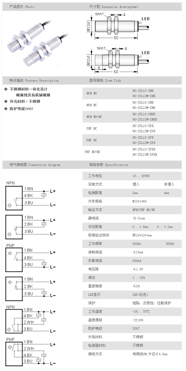 金屬探頭型接近開關(guān) HG-JSL12-ZNK,HG-JSL12M-ZNK,HG-JSL12-ZNB,HG-JSL12M-ZNB