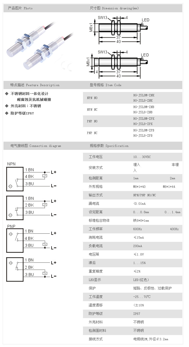 金屬探頭型接近開(kāi)關(guān) HG-JSL8M-ZNK,HG-JSL8-ZNK,HG-JSL8M-ZNB,HG-JSL8-ZNB,HG-JSL8M-ZPK,HG-JSL8-ZPK,HG-JSL8M-ZPB,HG