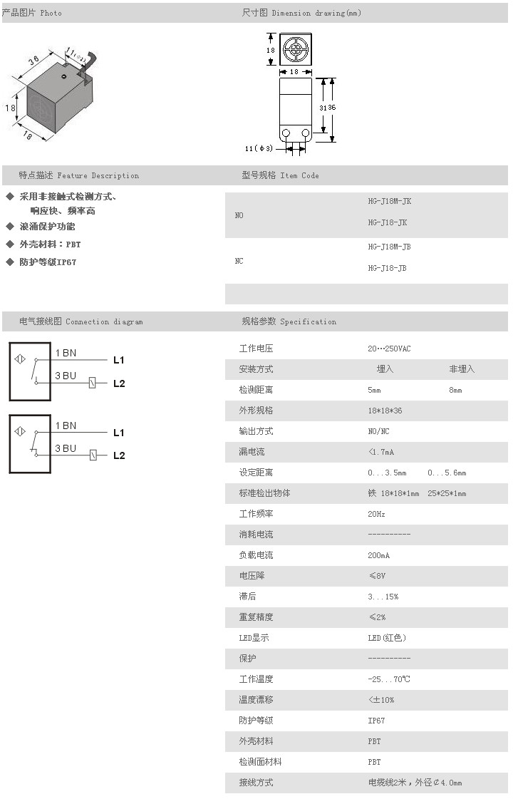 方型接近開關 HG-J18M-JK,HG-J18-JK,HG-J18M-JB,HG-J18-JB,