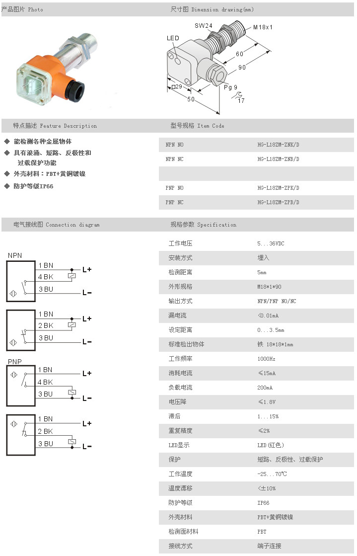 L18Z圓柱型接近開關(guān) HG-L18ZM-ZNK/D,HG-L18ZM-ZNB/D,HG-L18ZM-ZPK/D,HG-L18ZM-ZPB/D,