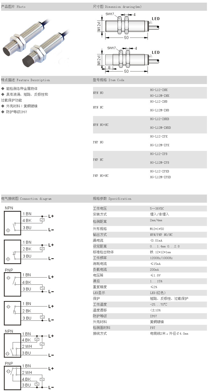 L12圓柱型接近開關 HG-L12-ZNK,HG-L12M-ZNK,HG-L12-ZNB,HG-L12M-ZNB,HG-L12-ZNKB,