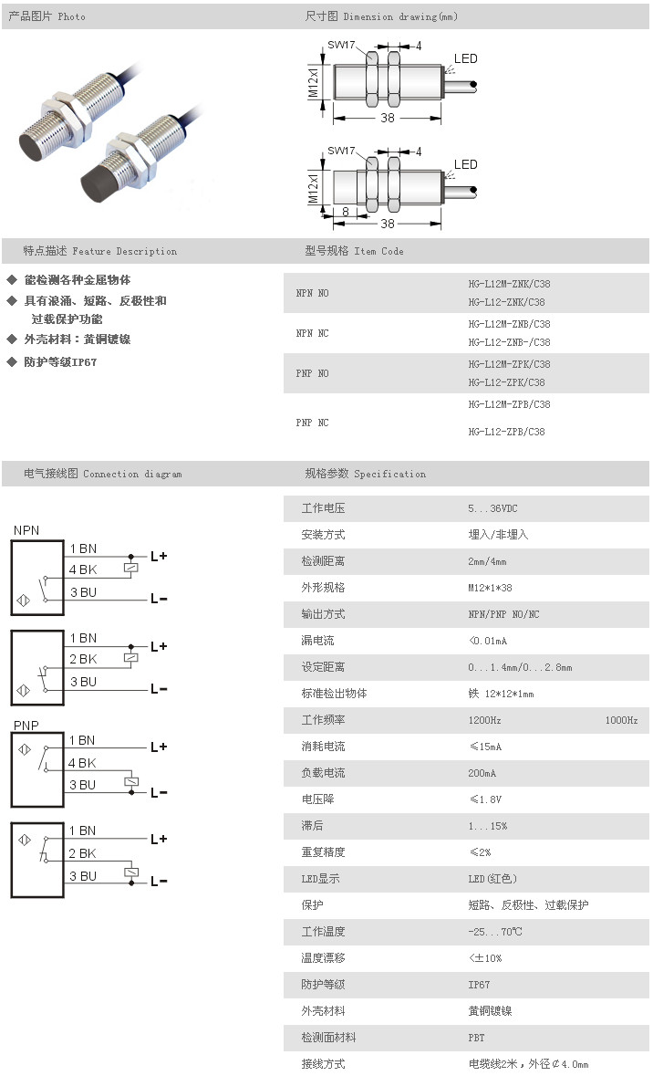 M12短圓柱型接近開關(guān) HG-L12M-ZNK/C38,HG-L12-ZNK/C38,HG-L12M-ZNB/C38,HG-L12-ZNB/C38,