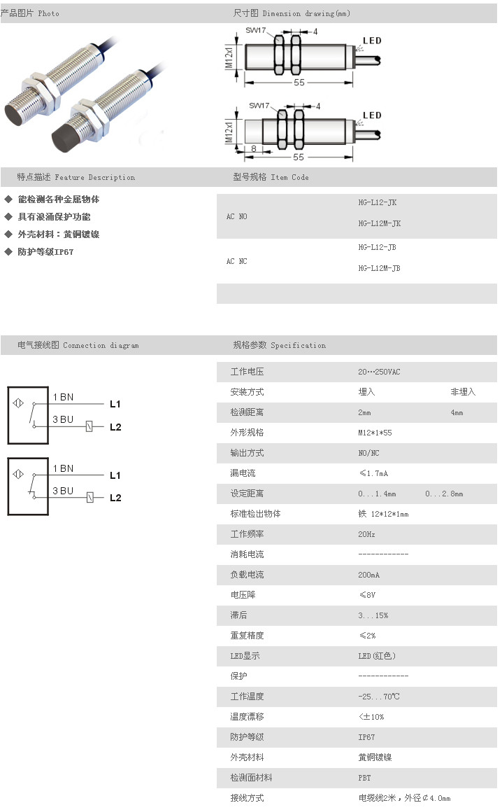 L12圓柱型接近開關 HG-L12-JK,HG-L12M-JK,HG-L12-JB,HG-L12M-JB,