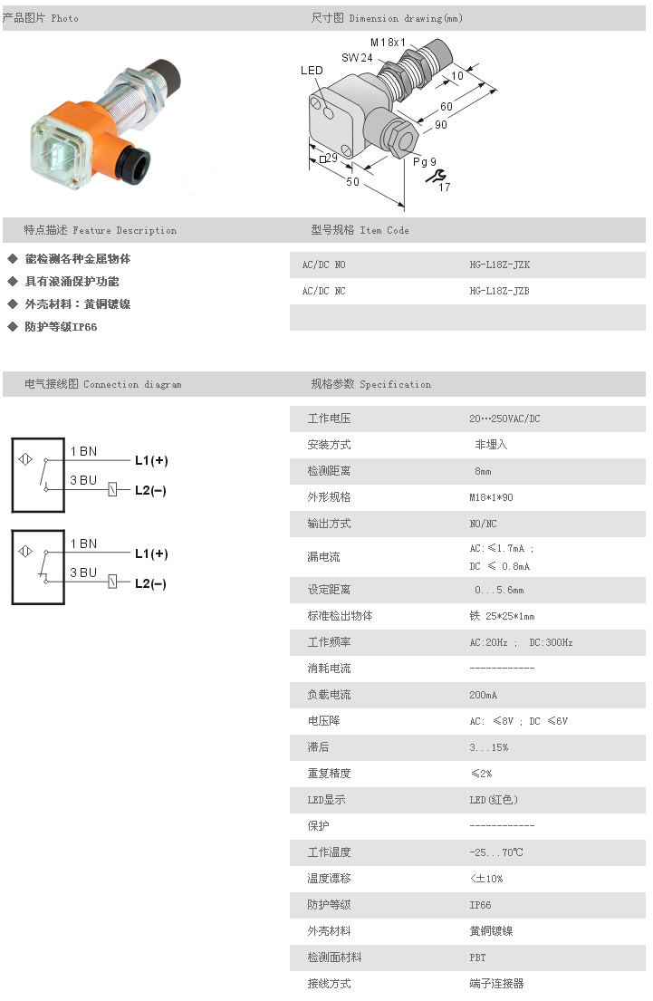 L18Z圓柱型接近開關(guān) HG-L18Z-JZK,HG-L18Z-JZB,