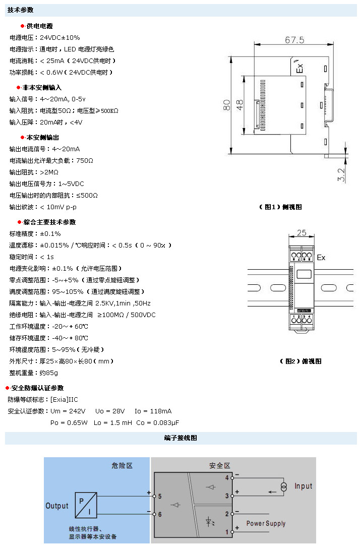 接受來自處于安全區(qū)的 DCS/PLC 系統(tǒng)或其它操作器的直流電流420mA信號,經(jīng)安全柵隔離傳送,輸出直流信號420mA (1~5V) ,驅(qū)動處于危險(xiǎn)現(xiàn)場的電氣轉(zhuǎn)換器、閥門定位器、顯示設(shè)備等本安儀表。