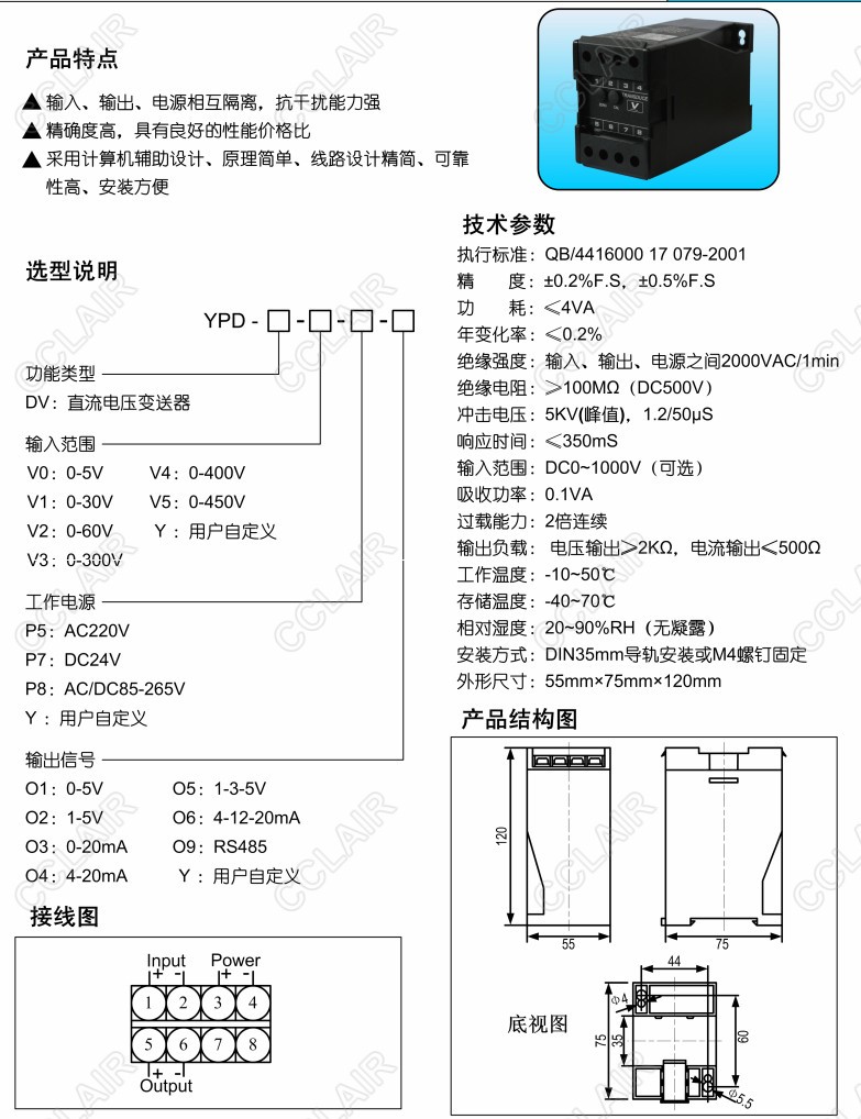 YPD-DV-V0-P5-O1,YPD-DV-V1-P7-O4,YPD-DV-V2-P5-O2,YPD-DV-V5-P8-O9,YPD-DV,直流電壓變送器