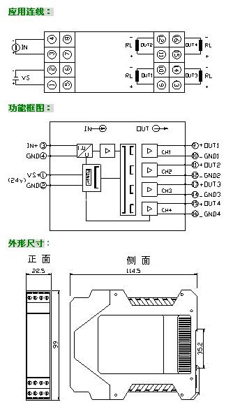 例:輸入4-20mA, 輸出4路信號(hào):4-20mA,供電24VDC
