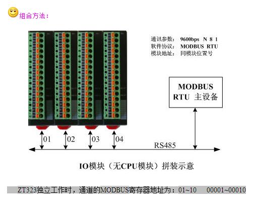 ZT323自帶一個RS485通訊口,內(nèi)部封裝了MODBUS協(xié)議,可以獨(dú)立工作,MODBUS從站地址等于從左向右排列的位置號。