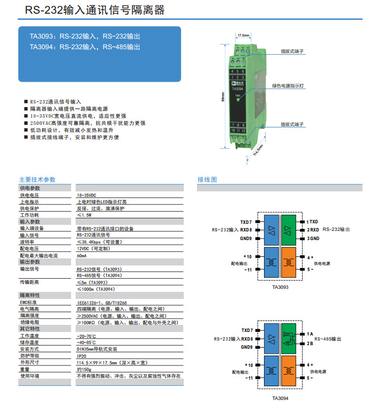 TA3093,TA3094,RS-232輸入通訊信號(hào)隔離器