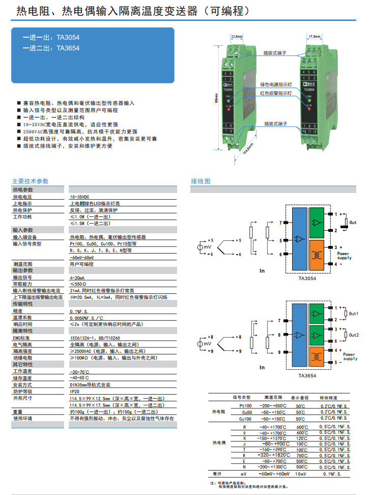 TA3054,TA3654,熱電阻、熱電偶輸入隔離溫度變送器(可編程)