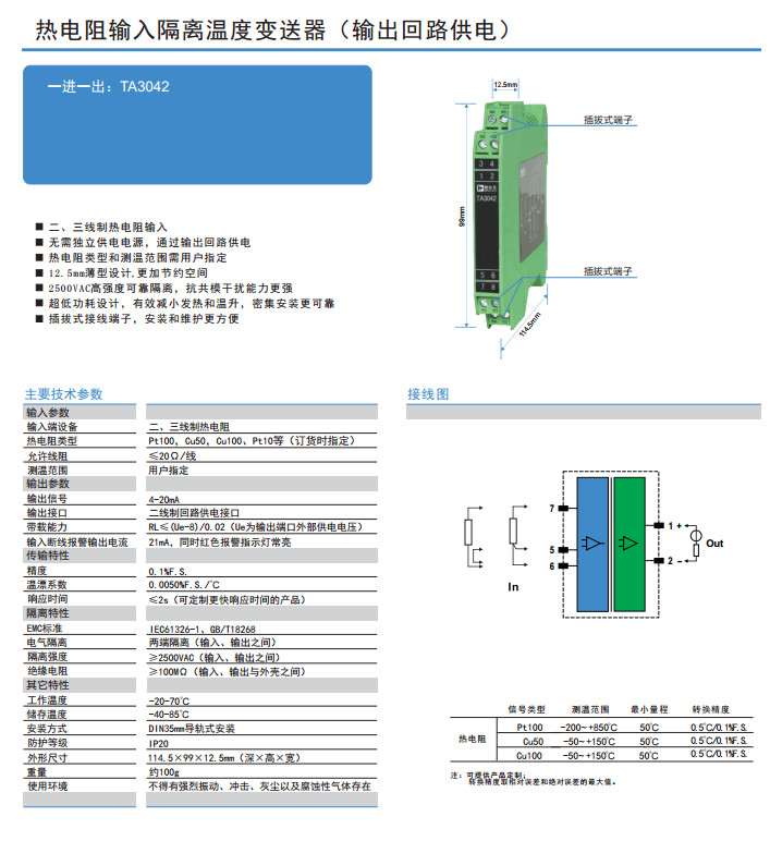 TA3042,熱電阻輸入隔離溫度變送器(輸出回路供電)