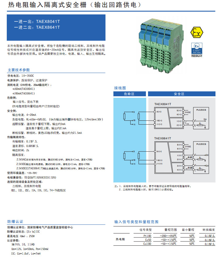 TAEX8041T,TAEX8641T,熱電阻輸入隔離式安全柵(輸出回路供電)
