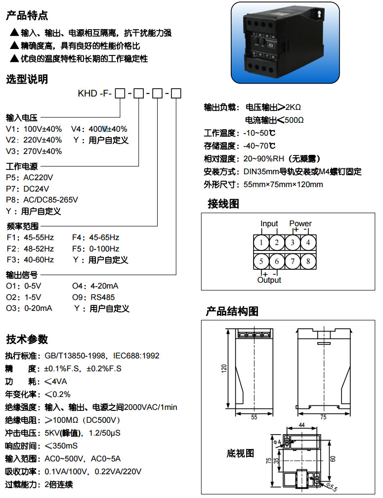 描述: 此型號為頻率變送器,45~55Hz工頻頻率信號輸入,頻率電壓是100Vac,輸出4~20mAdc, 工作電源AC220V。